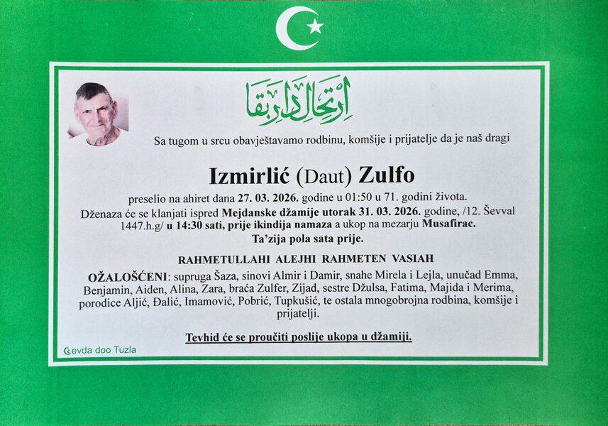 Preselio je na ahiret u 71. godini Zulfo (Dauta) Izmirlić. Neka mu je vječni rahmet. Laka mu bh. zemlja