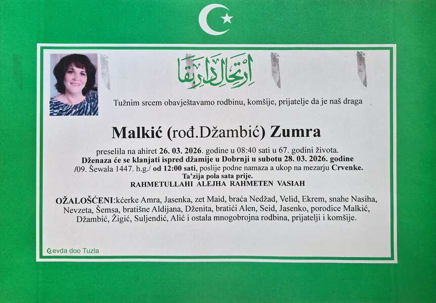 In memoriam: Zumra MALKIĆ (Džambić)Dženaza će se klanjati ispred džamije u Dobrnji, u subotu, 29. marta 2026. godine, u 12:00 sati. Ukop je na mezarju Crvenke. Laka joj bh. zemlja Desk28. 03. 2026.In memoriam, Info (Porodici, rodbini i prijateljima upućujemo iskreno saučešće – Tuzlalive.ba; Foto: PP Revda Tuzla) Post Views: 151 Podijeli