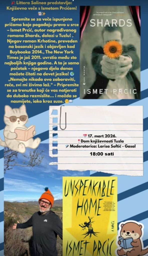 Udruženje književnika, bibliotekara, književnih kritičara i predstavnika kulturnih institucija Littera Salinea organizuje književno veče s bosanskohercegovačkim piscem Ismetom Prcićem. Događaj će biti održan 17. marta 2026. godine u 18 sati u prostorijama Doma književnosti na Sonom trgu u Tuzli, koji djeluje u okviru Centra za kulturu Tuzla.