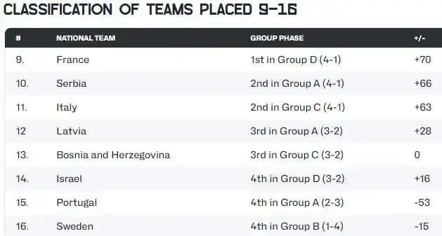 Iznenađujuće, aktuelni šampion Španija završila je tek na 17. poziciji, a iza nje su Belgija, Estonija, Crna Gora, Velika Britanija, Island, Češka i Kipar.