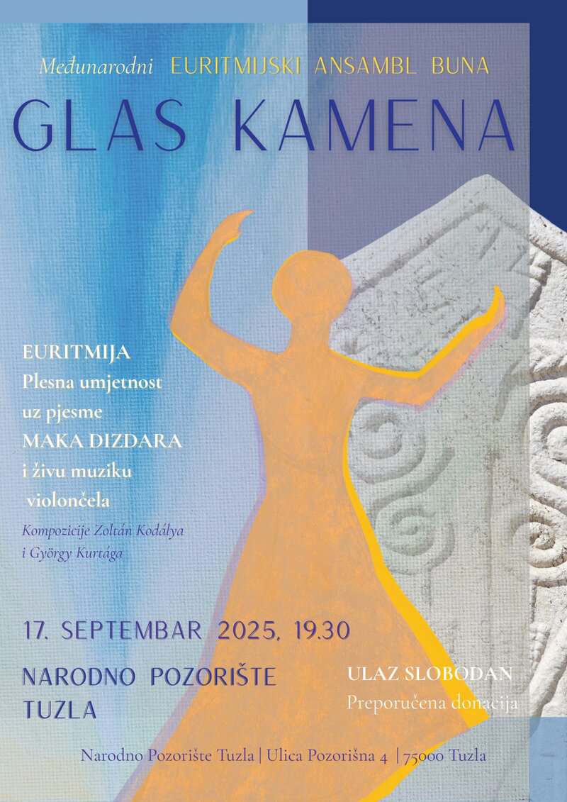Na sceni Narodnog pozorišta Tuzla publika će imati priliku doživjeti nesvakidašnji umjetnički događaj – predstavu „Glas kamena – Euritmija“ u izvedbi Plesnog ansambla Buna iz Njemačke, inspirisanu poezijom velikana Maka Dizdara, a događaj je zakazan za srijedu, 17. septembar u 19:30 sati.