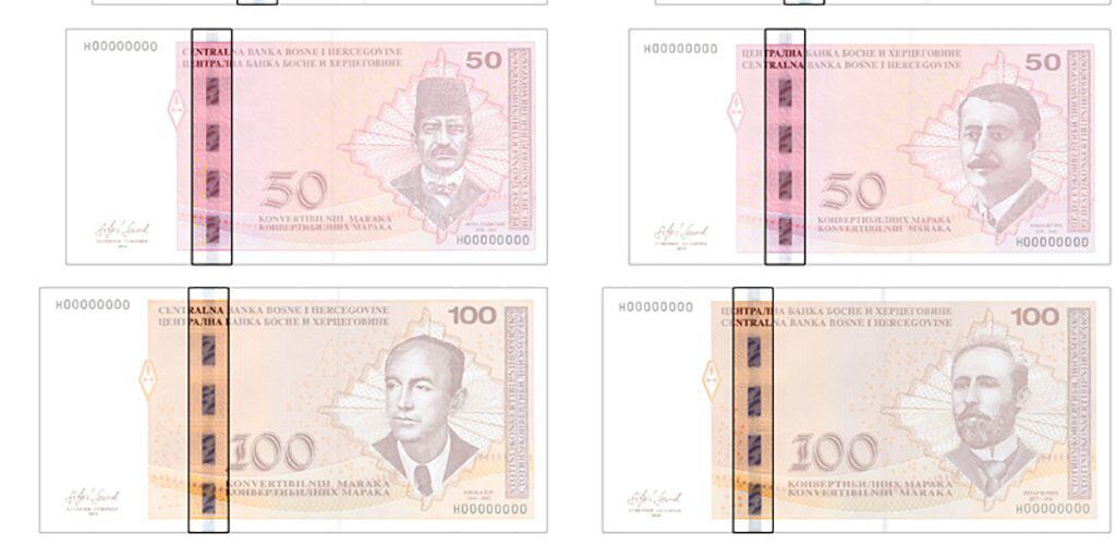 Novčanice apoena 10 KM, 20 KM, 50 KM i 100 KM koje su ostale u opticaju imaju unaprijeđena zaštitna obilježja čime se značajno otežava njihovo krivotvorenje, a istovremeno je lakše provjeriti njihovu autentičnost.