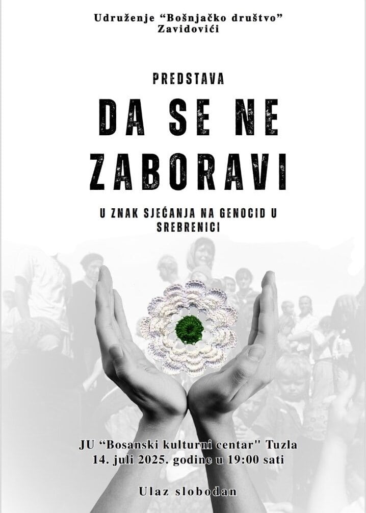Na inicijativu grupe mladih iz Zavidovića, u BKC-u Tuzla 14. jula ove godine (19 sati) bit će izvedena predstava “Da se ne zaboravi”, a povodom 30-godišnjice genocida u Srebrenici.