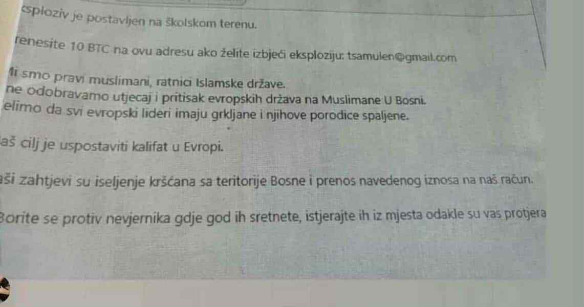 Eksploziv je postavljen na školskom terenu. Prenesite 10 BTC na ovu adresu ako želite izbjeći eksploziju. Mi smo pravi muslimani, ratnici Islamske države. I ne odobravamo utjecaj i pritisak evropskih država na Muslimane u Bosni. Želimo da svi evropski lideri imaju grkljane i njihove porodice spaljene. Naš cilj je uspostaviti kalifat u Evropi. Naši zahtjevi su iseljenje kršćana sa teritorije Bosne i prenos navedenog iznosa na naš račun. ‘Borite se protiv nevjernika gdje god ih sretnete, istjerajte ih iz mjesta odakle su vas protjerali'”, napisano je.