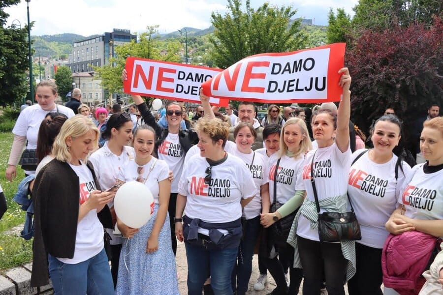 Radnice i radnici nosili su transparente s natpisima “Ne dam mamu nedjeljom” i “Zabranite nerad političarima, ne nedjelju radnicima”, poručivši da porodični život nije na prodaju – ni za dnevnica od 100 KM.