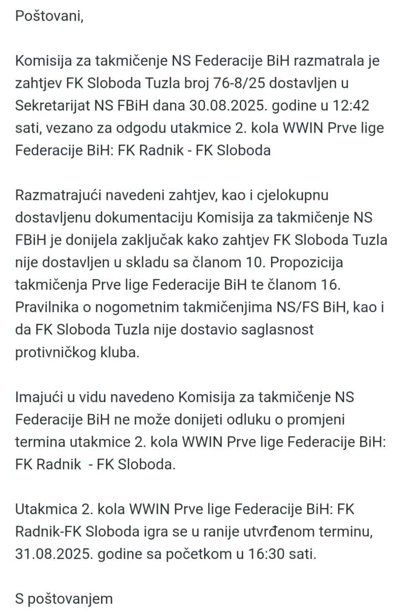 Imajući u vidu navedeno Komisija za takmičenje NS Federacije BiH ne može donijeti odluku o promjeni termina utakmice 2. kola WWIN Prve lige Federacije BiH: FK Radnik – FK Sloboda”, navedeno je iz NS FBiH.