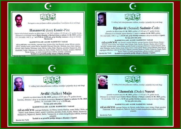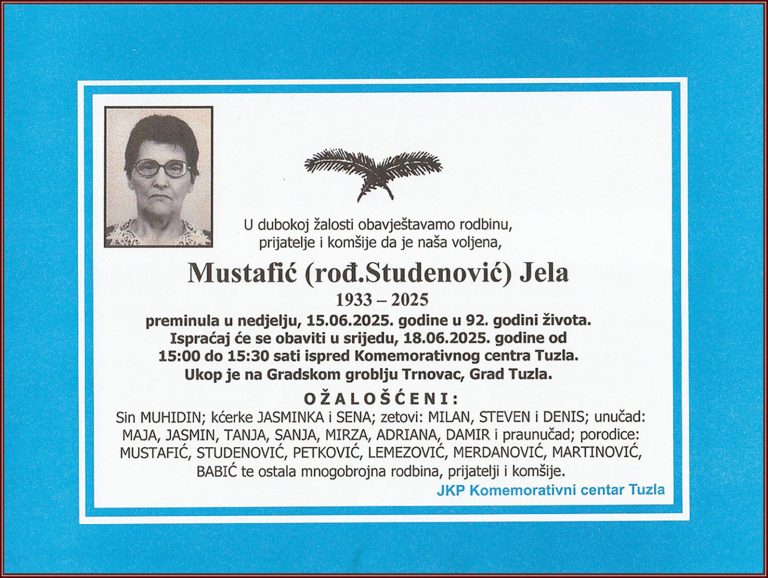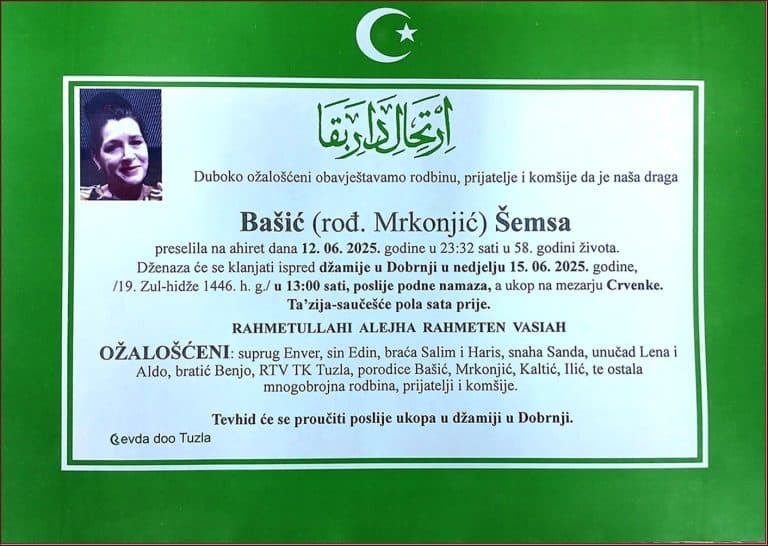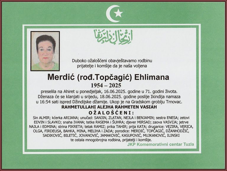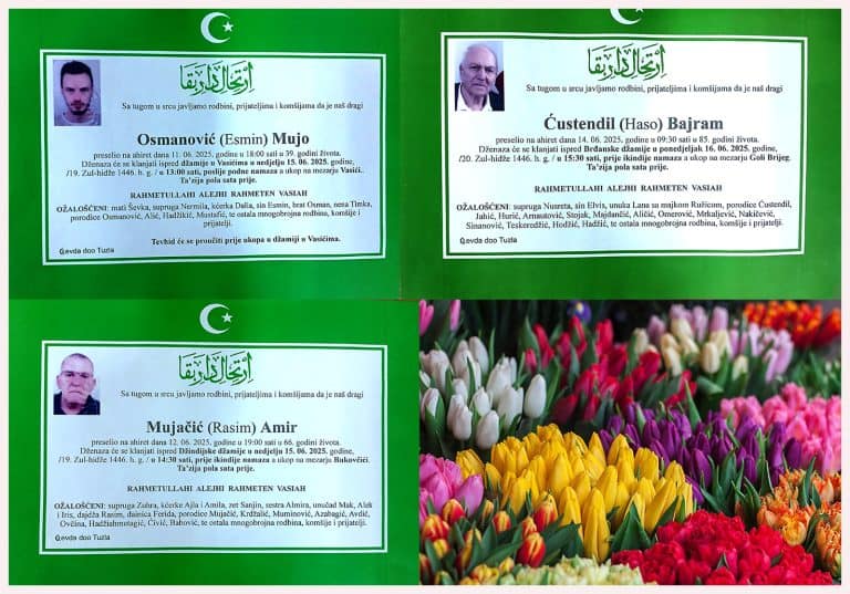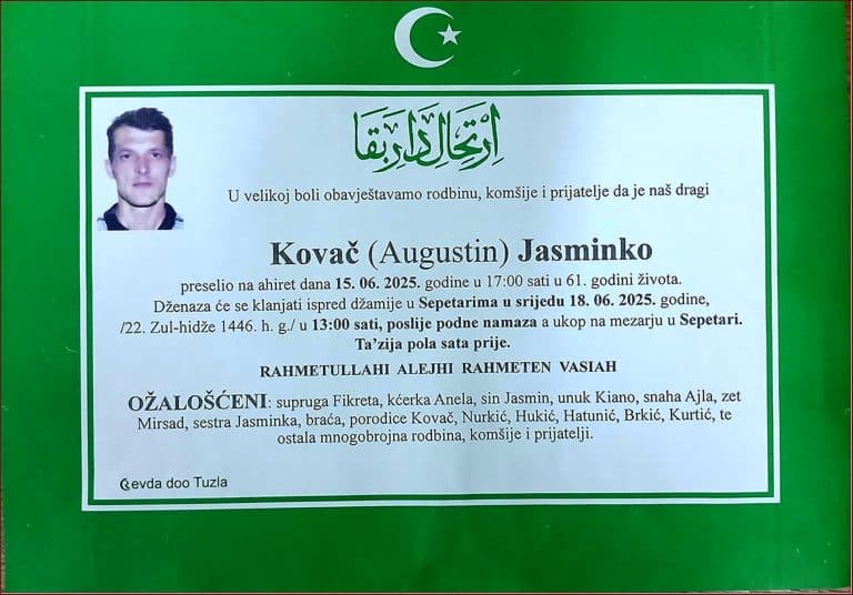 Dženaza će se klanjati ispred Mejdanske džamije u Tuzli, u petak, 9. decembra 2025. godine, u 12:30 sati. Ukop je na mezarju Musafirac