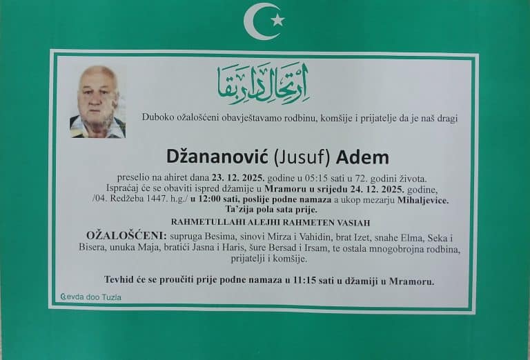 Ukop i vjerski obred obavit će se u petak, 26. decembra 2025. godine, u 13:00 sati, na Pravoslavnom groblju Trnovac u Tuzli