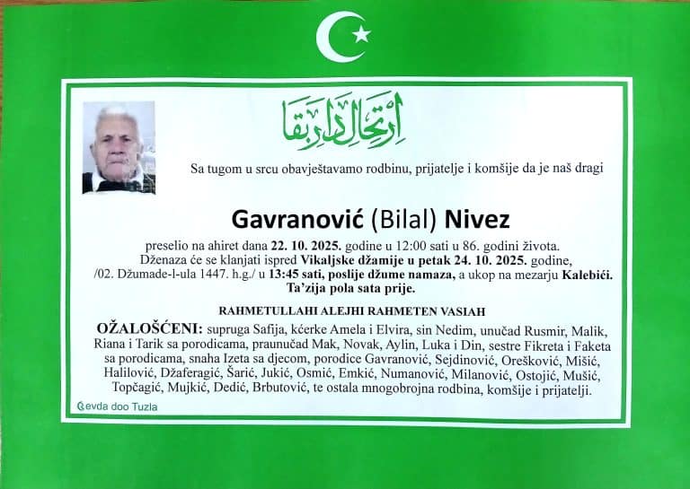 Preselilo je na ahiret više naših sugrađanki i sugrađana, prijatelja i komšija. Neka im je vječni rahmet dušama. Laka im bh. zemlja