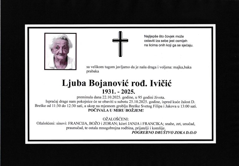 Ispraćaj i ukop pokojnice obavit će se u subotu, 25. oktobra 2025. godine na mjesnom groblju u Doknju. Počivala u miru Božjem!