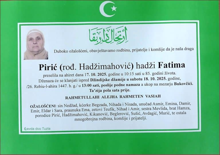 Dženaza će se klanjati ispred Džindijske džamije u Tuzli, u subotu, 18. oktobra 2025. godine, u 13:00 sati. Ukop je na mezarju Bukovčići
