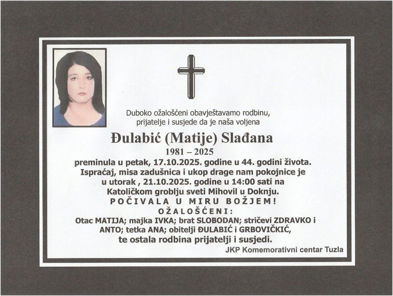 Prerano nas je, u 44. godini, napustila Slađana (Matije) ĐULABIĆ. Počivala u miru Božjem. Laka joj bh. zemlja