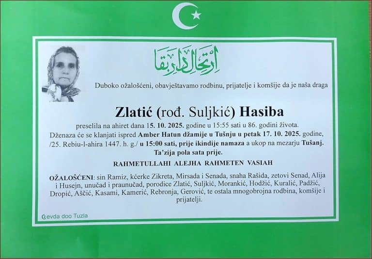 Dženaza će se klanjati ispred Brdžanske džamije u Tuzli, u ponedjeljak, 13. oktobra 2025. godine, u 15:36 sati, dok je ukop na mezarju Ilinčica