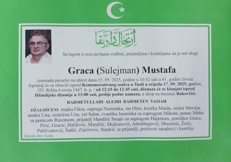 Dženaza će se klanjati ispred džamije Moluhe, u ponedjeljak, 22. septembra 2025. godine u 16:03 sati...