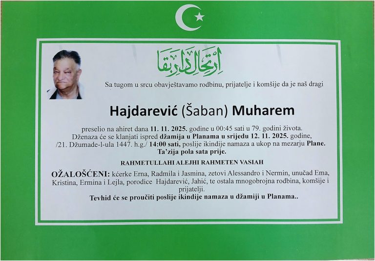 Dženaza će se klanjati ispred Bijele džamije u Slavinovićima, u četvrtak, 13. novembra 2025. godine u 14:00 sati