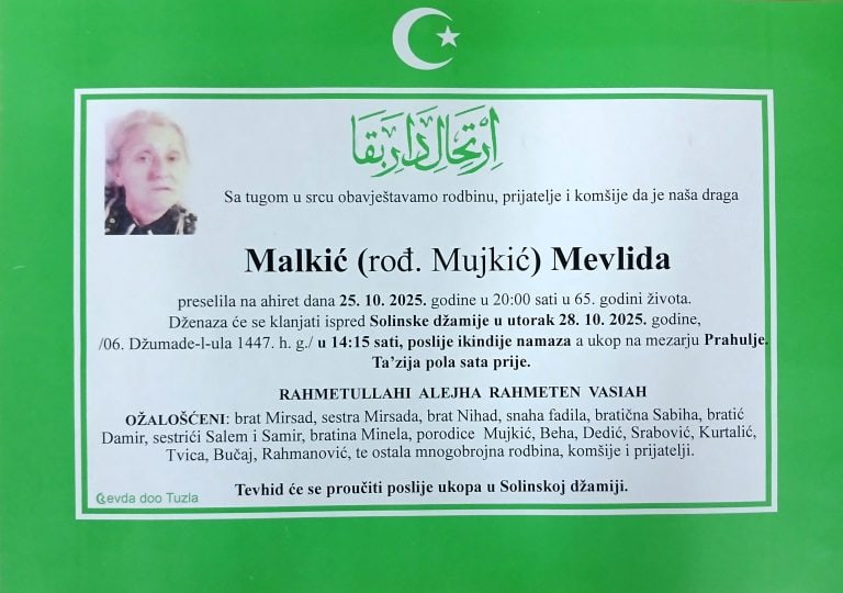 Dženaza će se klanjati u srijedu, 29. oktobra 2025. godine, ispred Brđanske džamije u Tuzli, u 12 sati. Ukop je na mezarju Ilinčica
