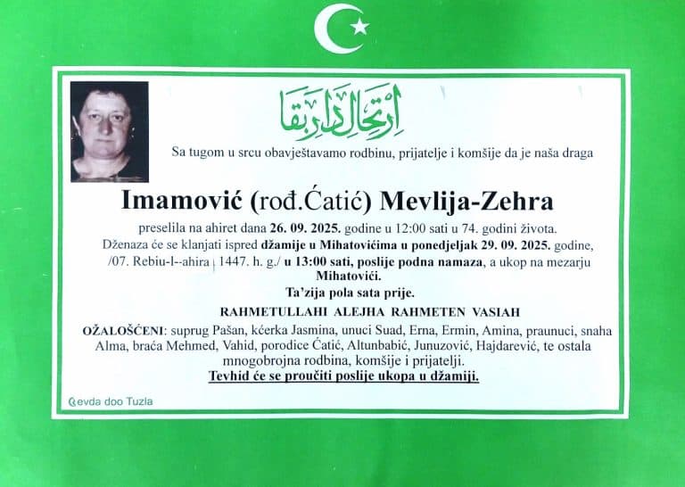 Preselila na ahiret u 68. godini. Dženaza će se klanjati ispred Džindijske džamije u Tuzli, u utorak, 30. septembra 2025. godine, u 13:00 sati. Laka joj bh. zemlja