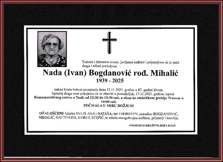 Ispraćaj pokojnika obavit će se u subotu, 22. novembra 2025. godine, od 12:30 do 13:00 ispred Komemorativnog centra Tuzla
