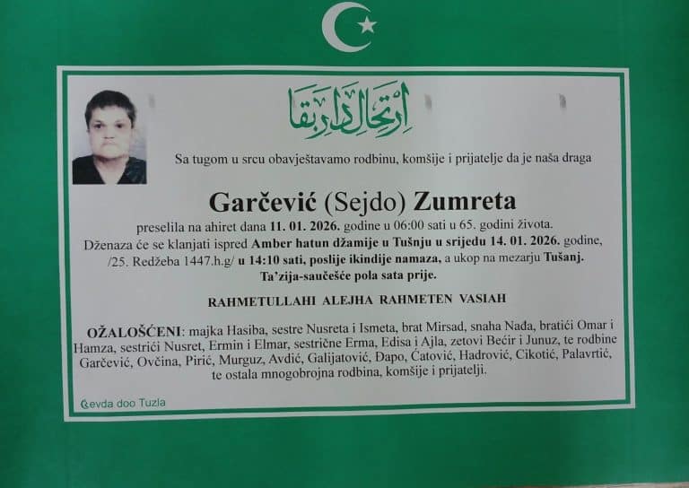Preminula je naša sugrađanka, prijateljica i komšinica, Rusmira IBRIŠBEGOVIĆ (Muftić). Neka je vječni rahmet njenoj duši. Dženaza će se klanjati ispred Džindijske džamije u utorak, 13. januara 2026. godine, u 14:10 sati...