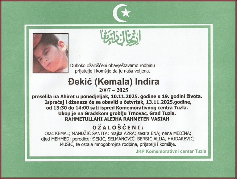 Ispraćaj će se obaviti u petak, 14. novembra 2025. godine od 13:30 do 14:00 sati, ispred Komemorativnog centra u Tuzli...
