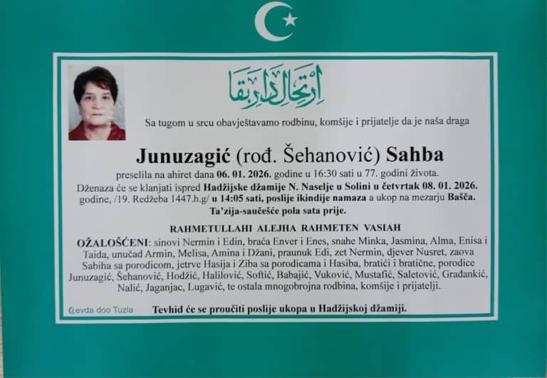 Dženaza će se klanjati ispred Džinndijske džamije u Tuzli, u subotu, 10. januara 2026. godine, u 12:00 sati. Ukop je na mezarju Bukovčići. Mir duši njenoj. Laka joj bh. zemlja