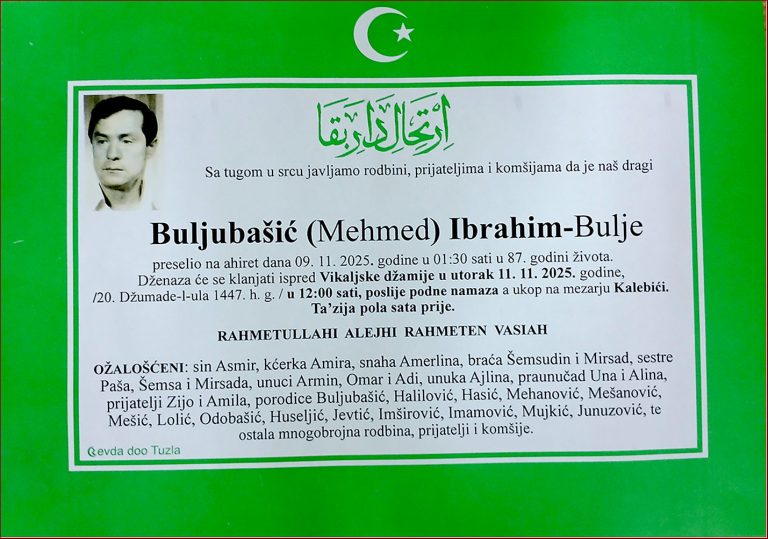 Dženaza će se klanjati ispred Vikaljske džamije u Tuzli, u utorak, 11. novembra 2025. godine, u 12:00 sati. Mir duši njegovoj. Laka mu bh. zemlja