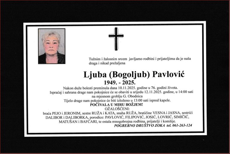 Ispraćaj, dženaza i ukop će se obaviti u srijedu, 12. novembra 2025. godine, na mezarju Saraj u Čaklovićima, od 11:30 do 12:00 sati. Mir duši njegovoj