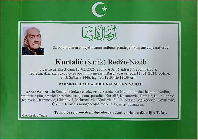 Ispraćaj i dženaza će se obaviti u srijedu, 12. februara 2025. godine, na mezarju Rasovac u Tuzli...