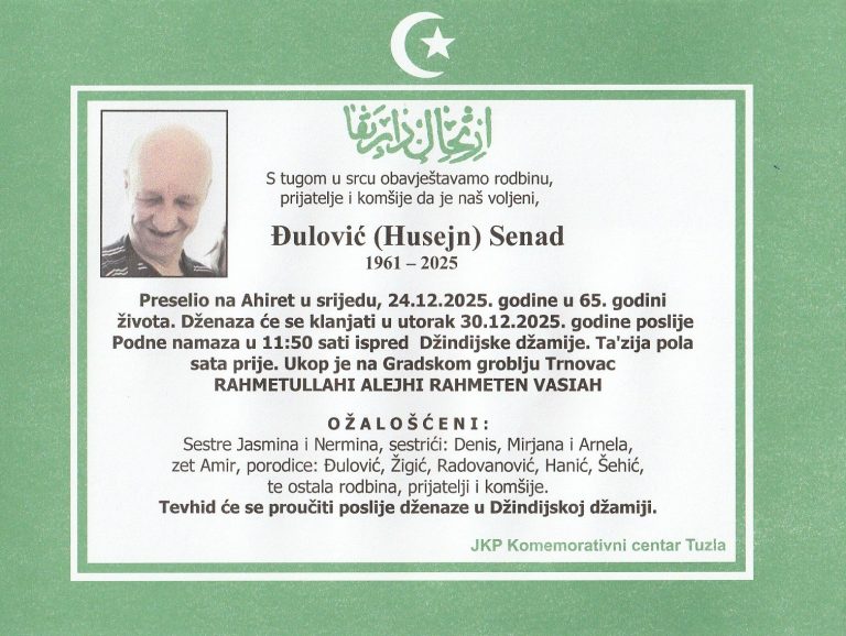 Dženaza će se klanjati ispred Džindijske džamije u Tuzli, u subotu, 27. decembra 2025. godine u 12 sati. Ukop je na mezarju Borić, Tuzla