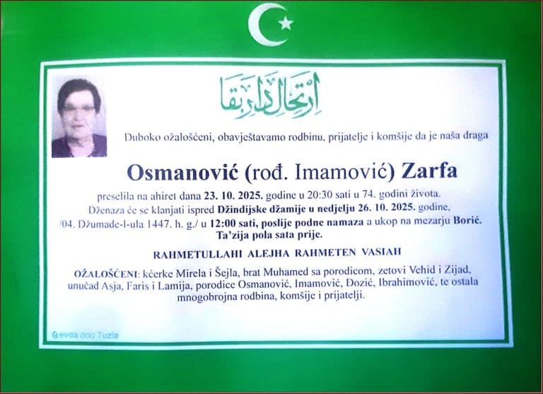 Preminula je u 74. godini naša sugrađanka, prijateljica i komšinica, Zarfa OSMANOVIĆ (Imamović). Upućujemo joj posljednji pozdrav. Neka joj je vječni rahmet duši. Laka joj bh. zemlja