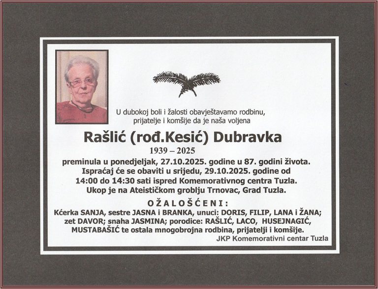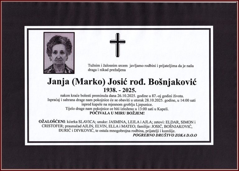 Ispraćaj i sahrana obavit će se u u četvrtak, 30. oktobra 2025. godine, u 15 sati, ispred kapele na mjesnom groblju Breze