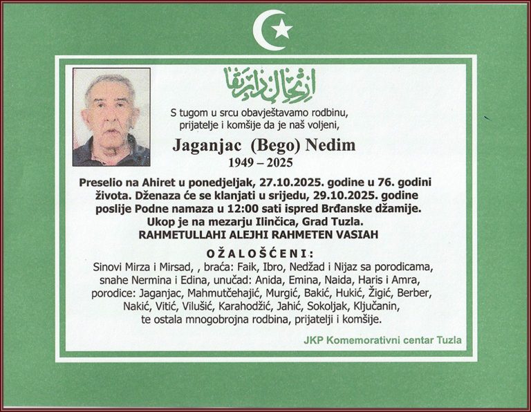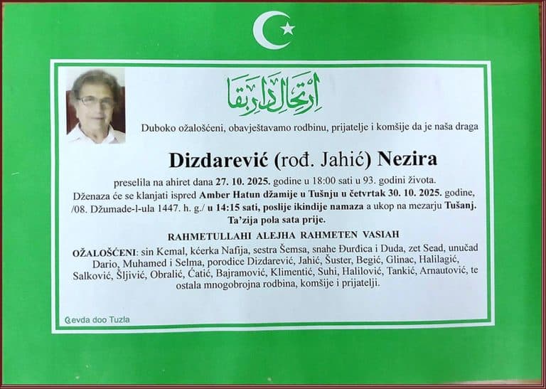 Dženaza će se klanjati u srijedu, 29. oktobra 2025. godine, ispred Brđanske džamije u Tuzli, u 12 sati. Ukop je na mezarju Ilinčica