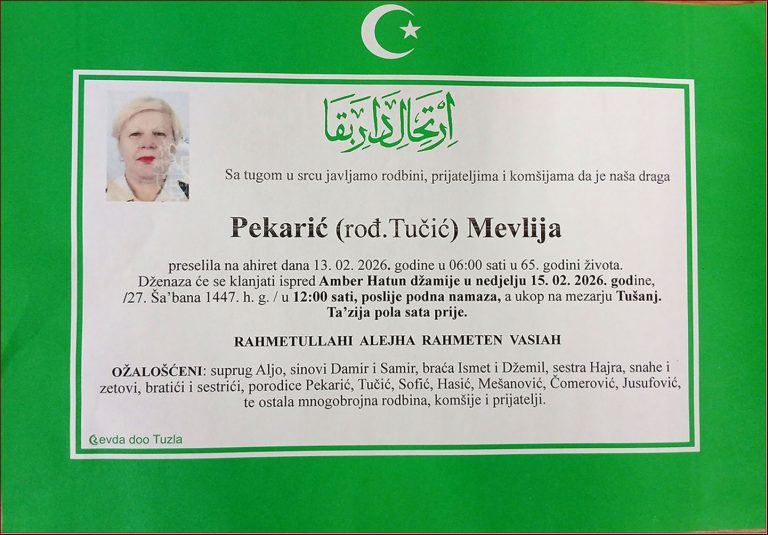Prerano nas je napustila Mevlija Pekarić (Tučić). Upućujemo joj posljednji pozdrav. Neka je vječni rahmet njenoj duši. Laka joj bh. zemlja
