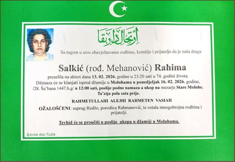 Dženaza će se klanjati ispred džamije u Moluhama, u ponedjeljak, 16. februara 2026. godine, u 12:00 sati. Ukop je na mezarju Stare Moluhe. Mir duši njenoj. Laka joj bh. zemlja