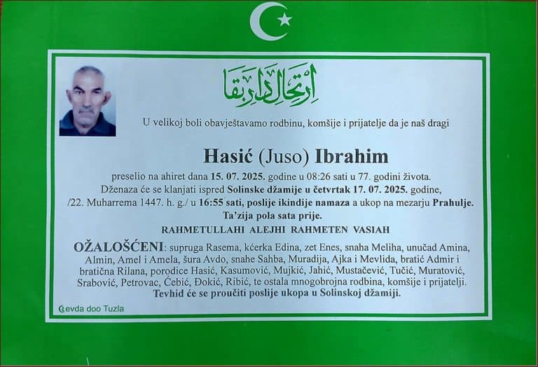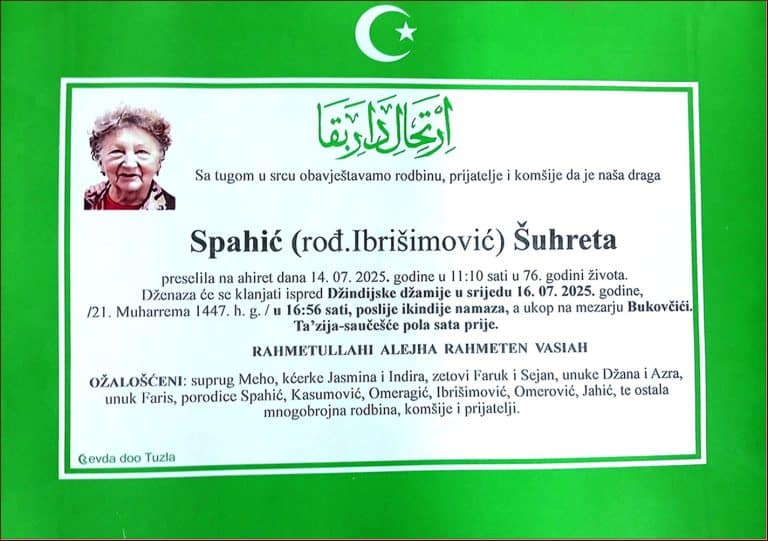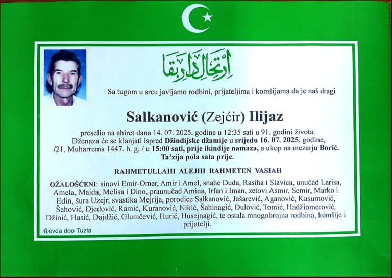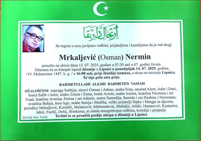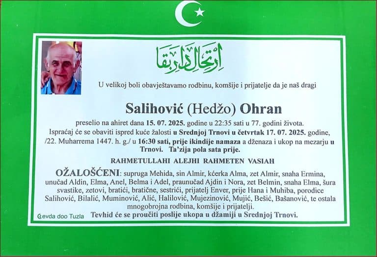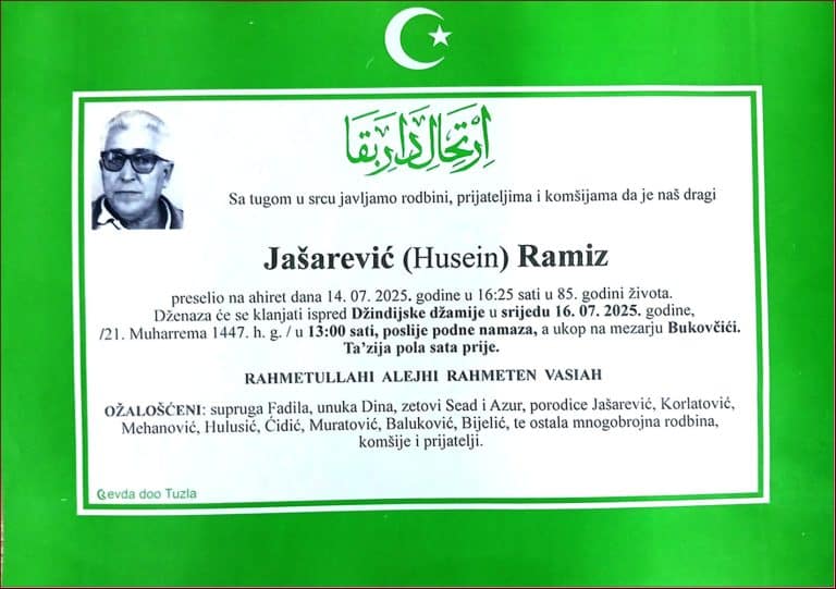 Dženaza će se klanjati ispred Amber Hatun džamije u Tušnju, u četvrtak, 11. decembra 2025. godine, u 13:50 sati. Laka mu bh. zemlja