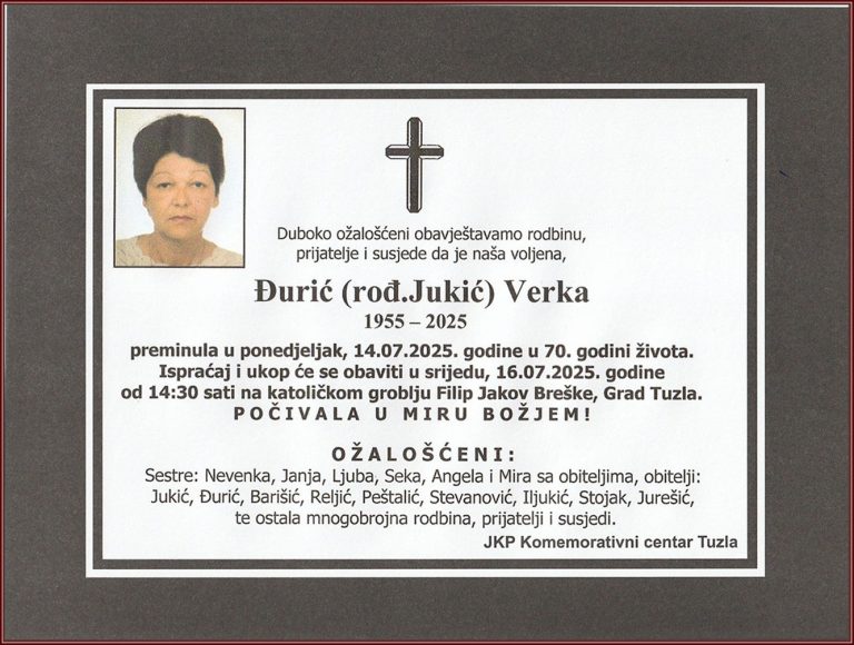 Sveta misa zadušnica slavit će se u ponedjeljak, 15. decembra/prosinca 2025. godine, u 12:00 sati, u crkvi sv. Petra i Pavla, nakon čega slijedi ukop na groblju Borić u Tuzli