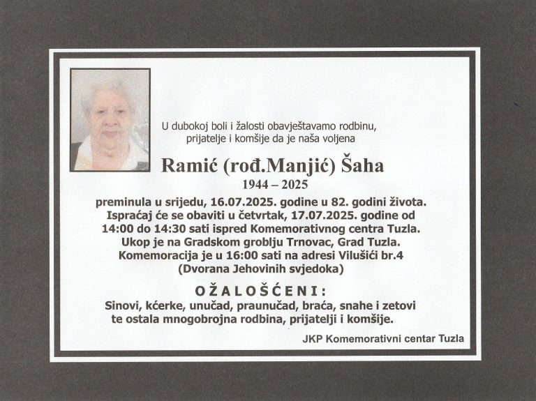 Ispraćaj će se obaviti ispred kuće žalosti u Mramoru, u srijedu, 10. decembra 2025. godine, u 12:45 sati. Mir duši njenoj. Laka joj bh. zemlja