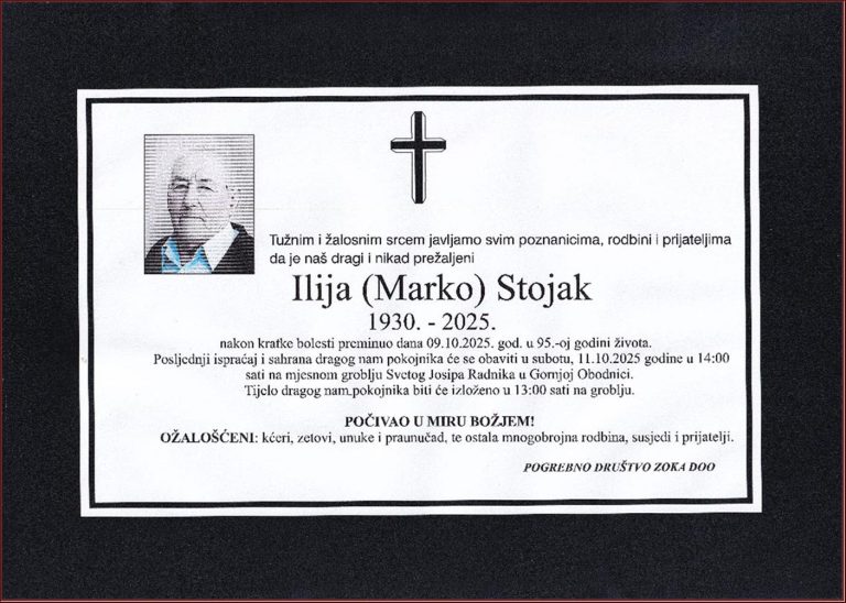 Posljednji ispraćaj i sahrana pokojnika obavit će se u subotu, 11. oktobra 2025. godine u 14:00 sati, na mjesnom groblju u Gornjoj Obodnici