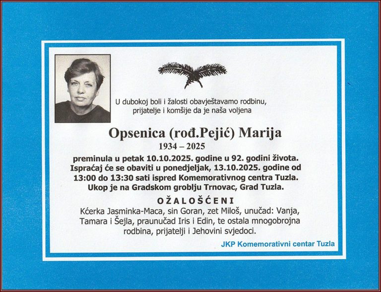 Ispraćaj će se obaviti u ponedjeljak, 13. oktobra 2025. godine, ispred Komemorativnog centra u Tuzli, u vremenu od 13:00 do 13:30 sati. Mir duši njenoj. Saučešće porodici i rodbini. Laka joj bh. zemlja