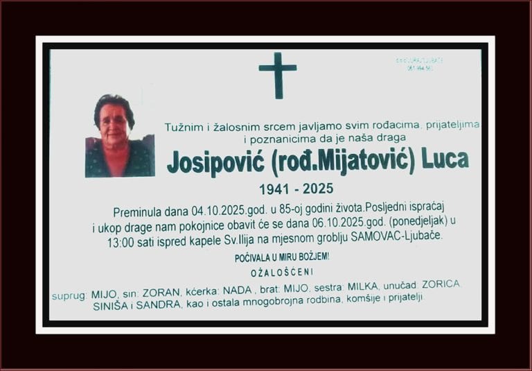 Posljednji ispraćaj obavit će se u ponedjeljak, 6. oktobra 2025. godine, u 13:00 sati, ispred kapele na mjesnom groblju Samovac - Ljubače