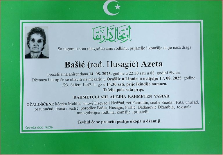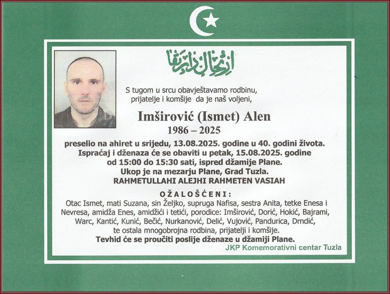 Dženaza i ukop će se obaviti u nedjelju, 17. augusta 2025. godine u 14:30 sati