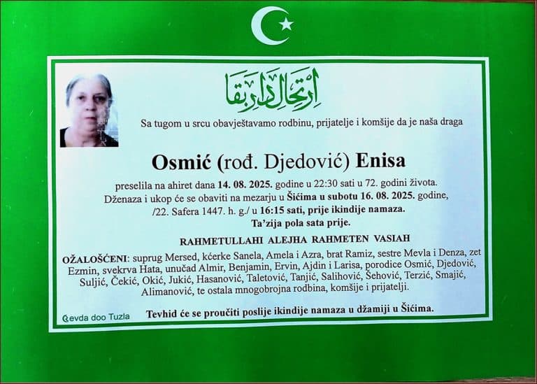 Preselila je na ahiret Enisa OSMIĆ (Djedović) u 72. godini. Neka joj je vječni rahmet duši. Laka joj bh. zemlja. Porodici saučešće i sabur