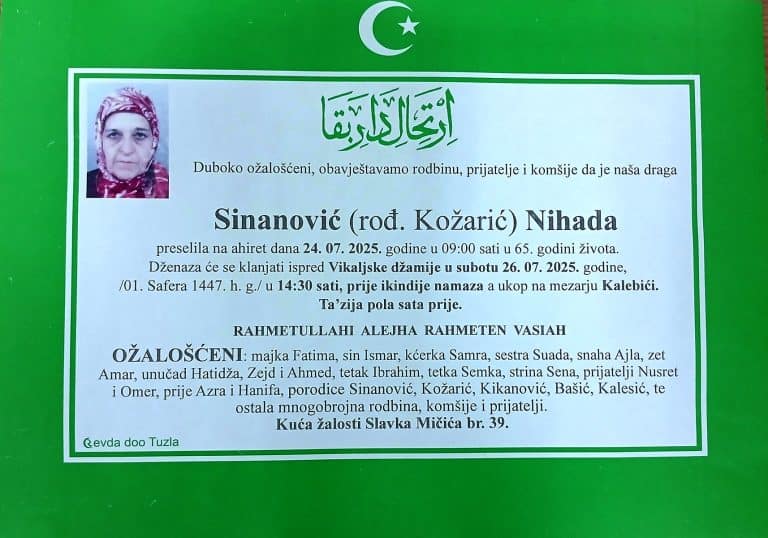 Dženaza će se klanjati ispred Solinske džamije, u ponedjeljak, 28. jula 2025. godine...