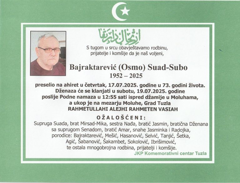 Ispraćaj će se obaviti u srijedu, 23. jula 2025. godine, ispred Komemorativnog centra u Tuzli, od 16:00 do 16:30. Ukop je na Gradskom groblju Trnovac u Tuzli