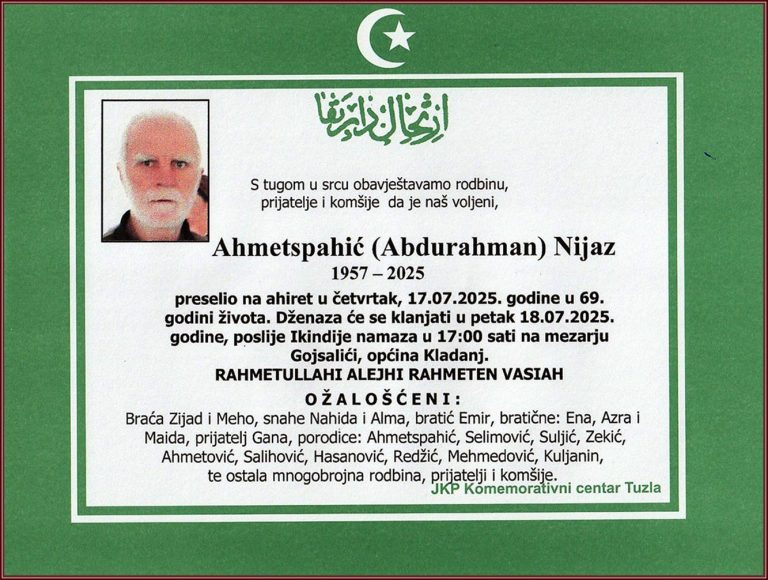 Dženaza će se klanjati ispred Džindijske džamije u Tuzli, u srijedu, 16. jula 2025. godine, od 13 sati, dok je ukop na mezarju Bukovčići u Tuzli