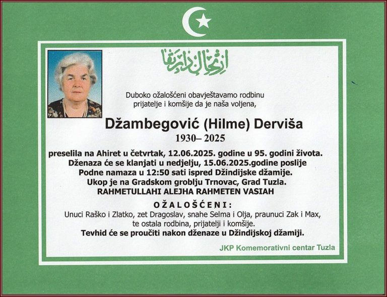 Dženaza će se klanjati u nedjelju, 15. juna 2025. godine, ispred Džindijske džamije u Tuzli u 12:50 sati. Ukop je na Gradskom groblju Trnovac
