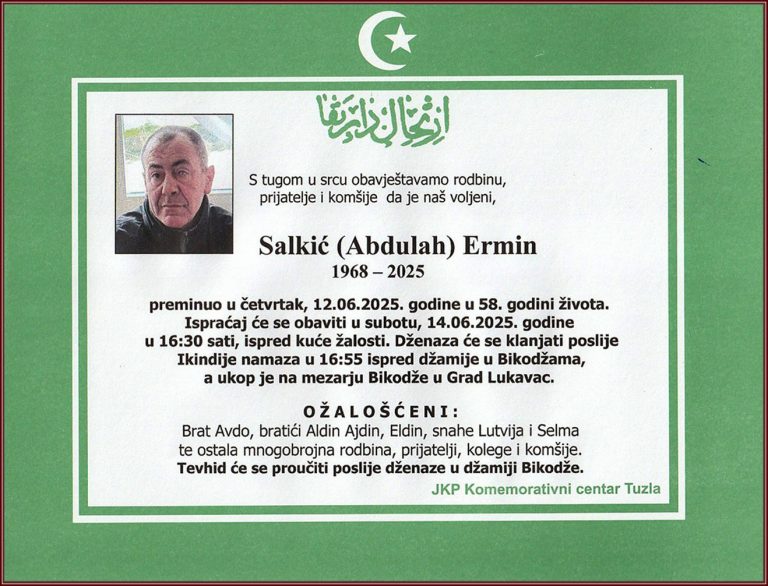 Prerano nas je, u 58. godini, napustio Ermin (Abdulaha) Salkić. Neka je vječni rahmet njegovoj duši. Laka mu bh. zemlja. Porodici saučešće i sabur...