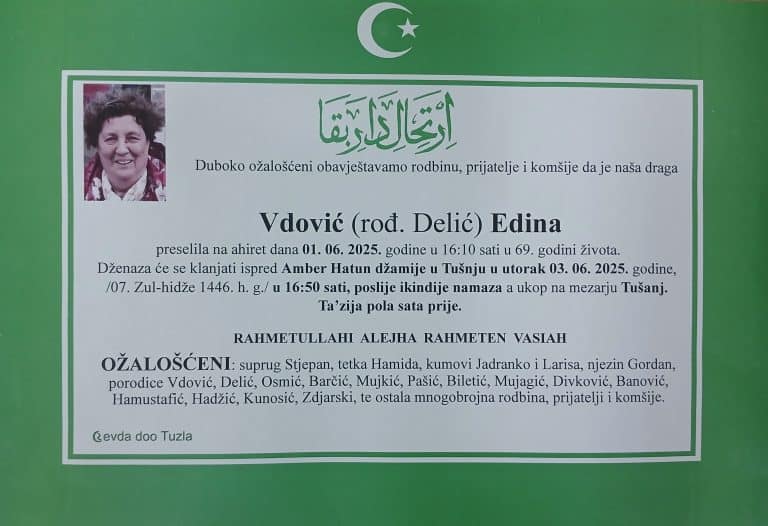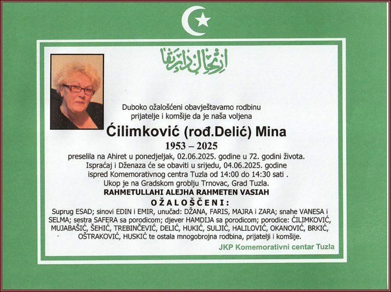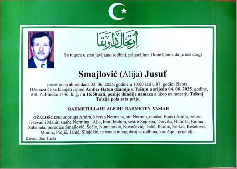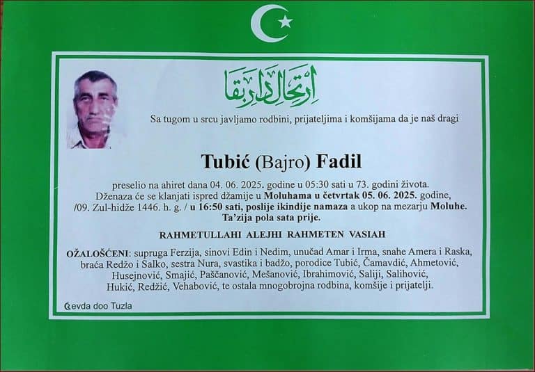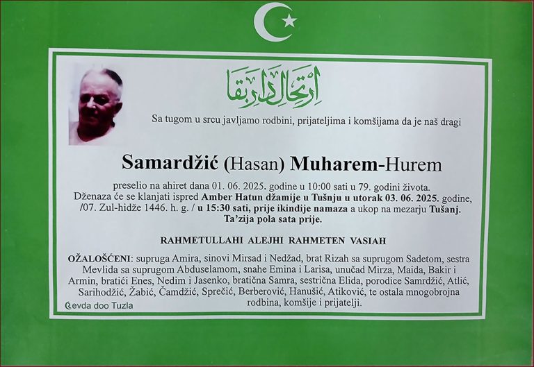 Dženaza će se klanjati ispred Džindijske džamije u Tuzli, u utorak, 3. juna 2025. godine, dok je ukop na Gradskom groblju Trnovac. Porodici saučešće...