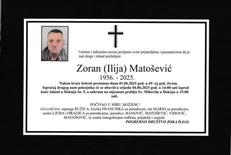 Ispraćaj će se obaviti u srijedu, 4. juna 2025. godine u 14 sati, ispred kuće žalosti u Doknju