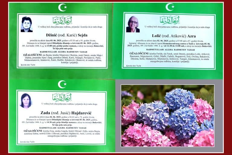 Sve džanaze klanjat će se u subotu, 7. juna 2025. godine. Porodicama i rodbini upućujemo saučešće. Mir dušama njihovim. Laka im bh. zemlja...